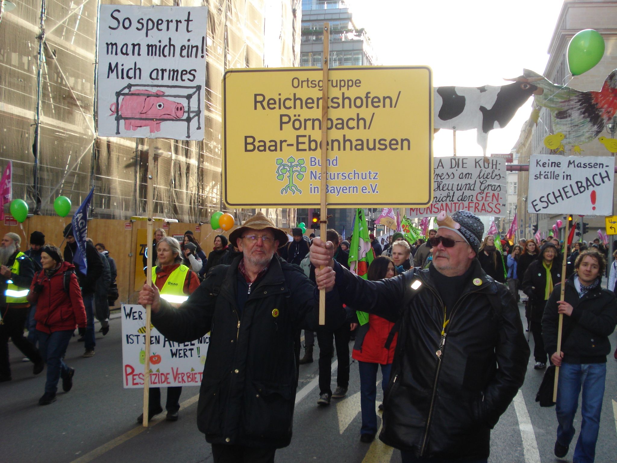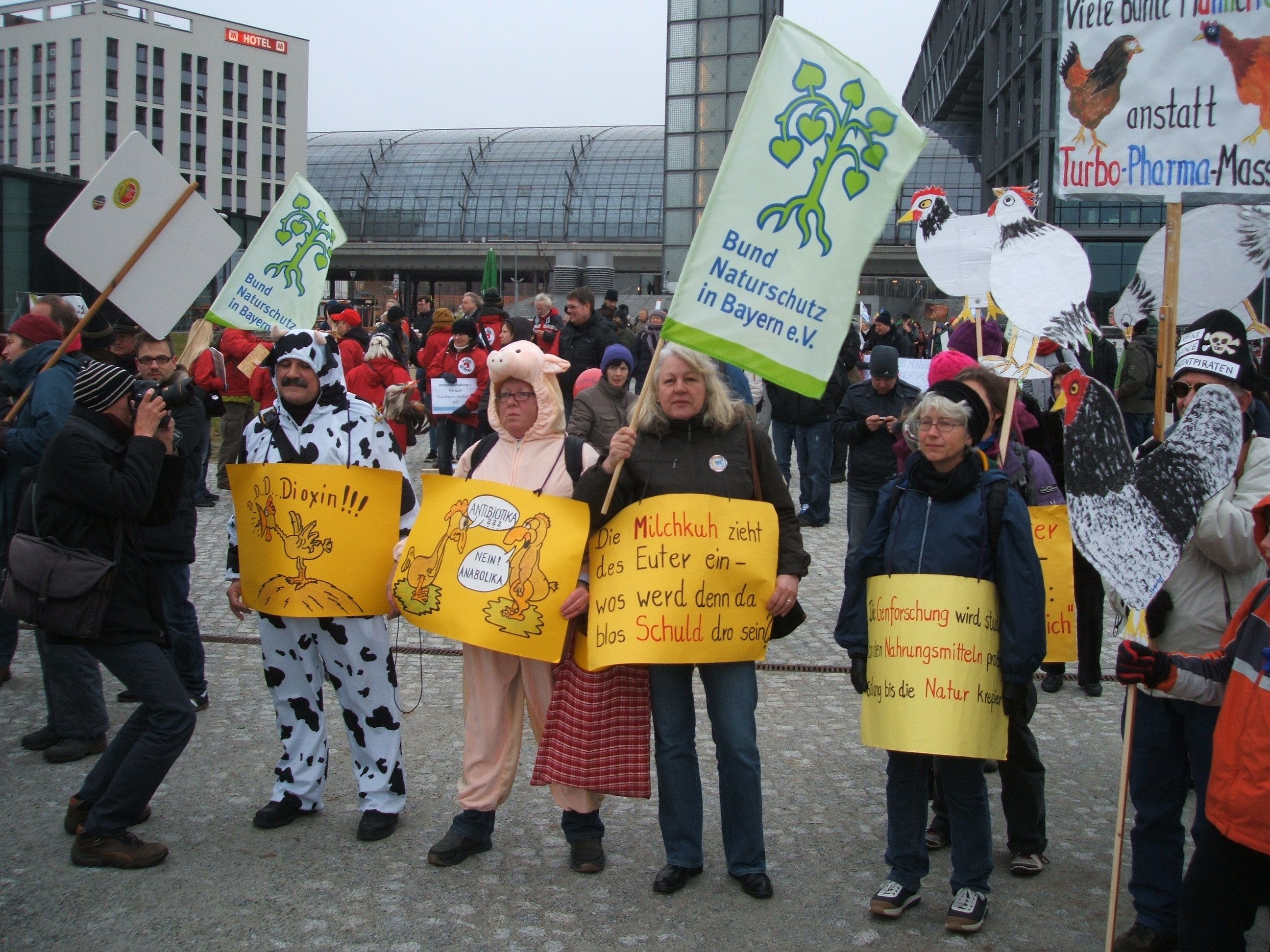 Presseerklärung: Zum Auftakt der Grünen Woche in Berlin protestierten ca. 30 000 Menschen gegen die Industrialisierung der Landwirtschaft, Massentierhaltung, Ausverkauf der Agrarflächen und Gentechnik auf dem Acker. Unter dem Motto " Wir haben es satt!" versammelten sie sich am Potzdamer Platz, um dann vorbei an zahlreichen Regierungsgebäuden zur Kundgebung vor dem Kanzleramt zu ziehen. Mehr als hundert Organisationen weltweit haben sich zu einem Bündnis zusammengeschlossen. Sie fordern die Wende zu einer von Familien betriebenen, bäuerlichen, flächengebundenen Landwirtschaft. Auch aus Oberbayern fuhren zwei Busse mit ca. hundert Teilnehmern, organisiert von Tagwerk Dorfen, Zivilcourage, Bund Naturschutz Pfaffenhofen und Ingolstadt. Die fantasievollen Tierfiguren der Reichertshofener Ortsgruppe des BN waren ein viel beachteter Anziehungspunkt für Fotografen und Fernsehteams.